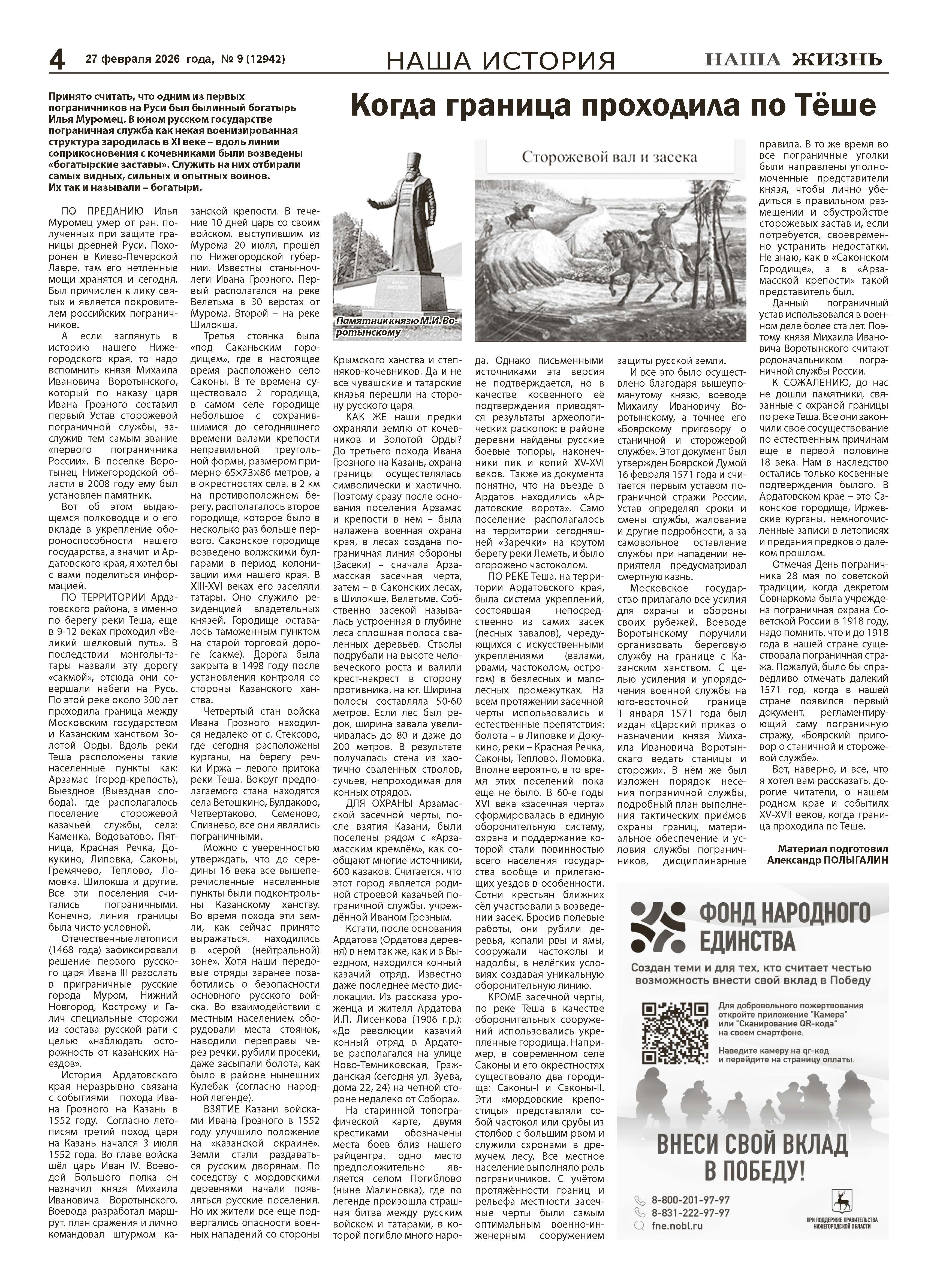 А если заглянуть в историю нашего Нижегородского края, то надо вспомнить князя Михаила Ивановича Воротынского, который по наказу царя Ивана Грозного составил первый Устав сторожевой пограничной службы, заслужив тем самым звание «первого пограничника России». В поселке Воротынец Нижегородской области в 2008 году ему был установлен памятник.