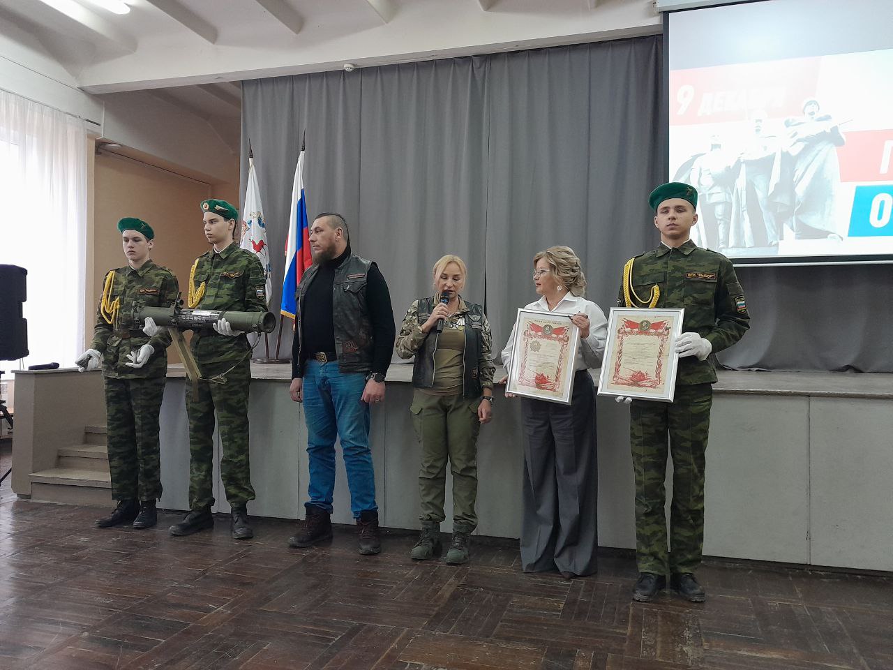 Представители мотоклубов «Ночные валькирии» и «Ночные волки» Галия и Михаил подарили для музея школы корпус гранатомета, осколки и гильзы, привезенные с СВО полученные от бойцов в период доставки гуманитарного груза на линию боевого соприкосновения. Также для школьного музея были подарены оригиналы 2-х Почетных грамот времен Великой Отечественной войны.